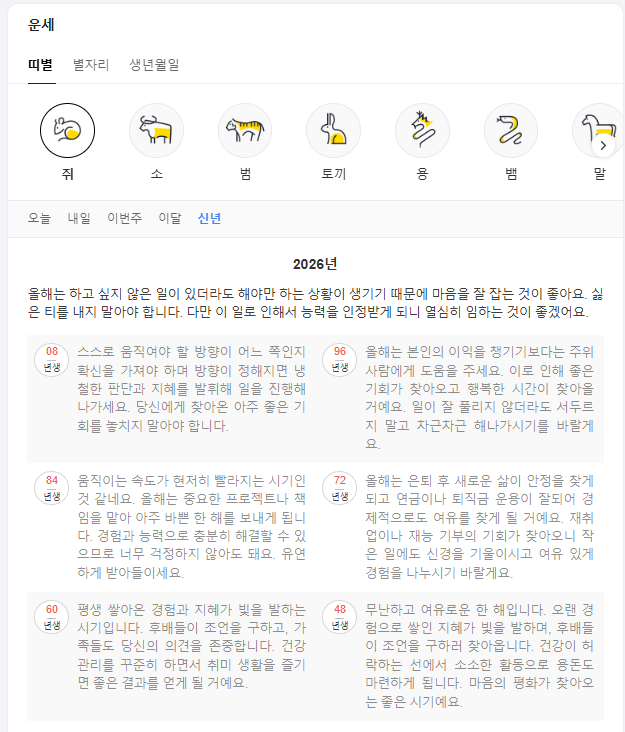 특히 올해는 개개인의 재물운, 건강운, 직장운, 인간관계 등 세부적인 운세까지 무료로 확인할 수 있는 서비스들이 다양하게 제공되고 있어, 누구나 쉽게 자신의 운세를 살펴볼 수 있습니다.