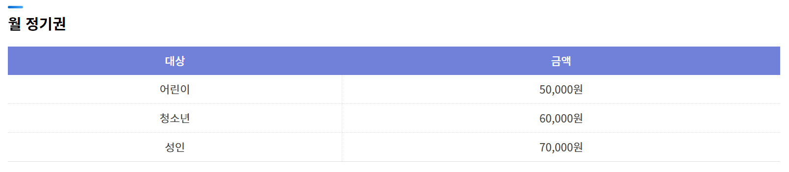 - 성인 월정기권: 약 70,000원