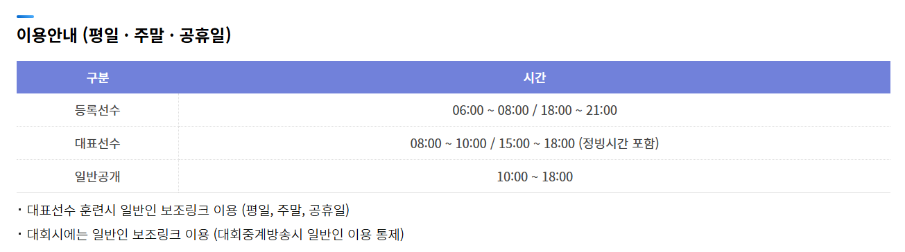 - 주말이나 공휴일에는 혼잡할 수 있으며 대표선수 훈련시간에는 일반 이용자 구역이 변경될 수 있으므로 사전 확인이 필요합니다.